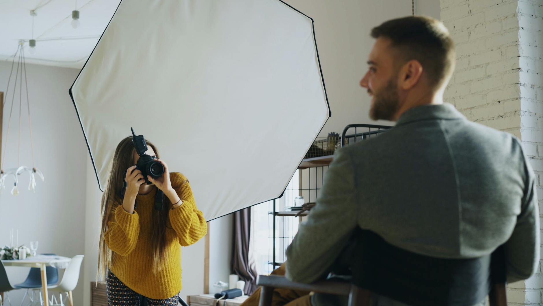 Fotograf wykonuje portret modelki w studiu z profesjonalnym oświetleniem