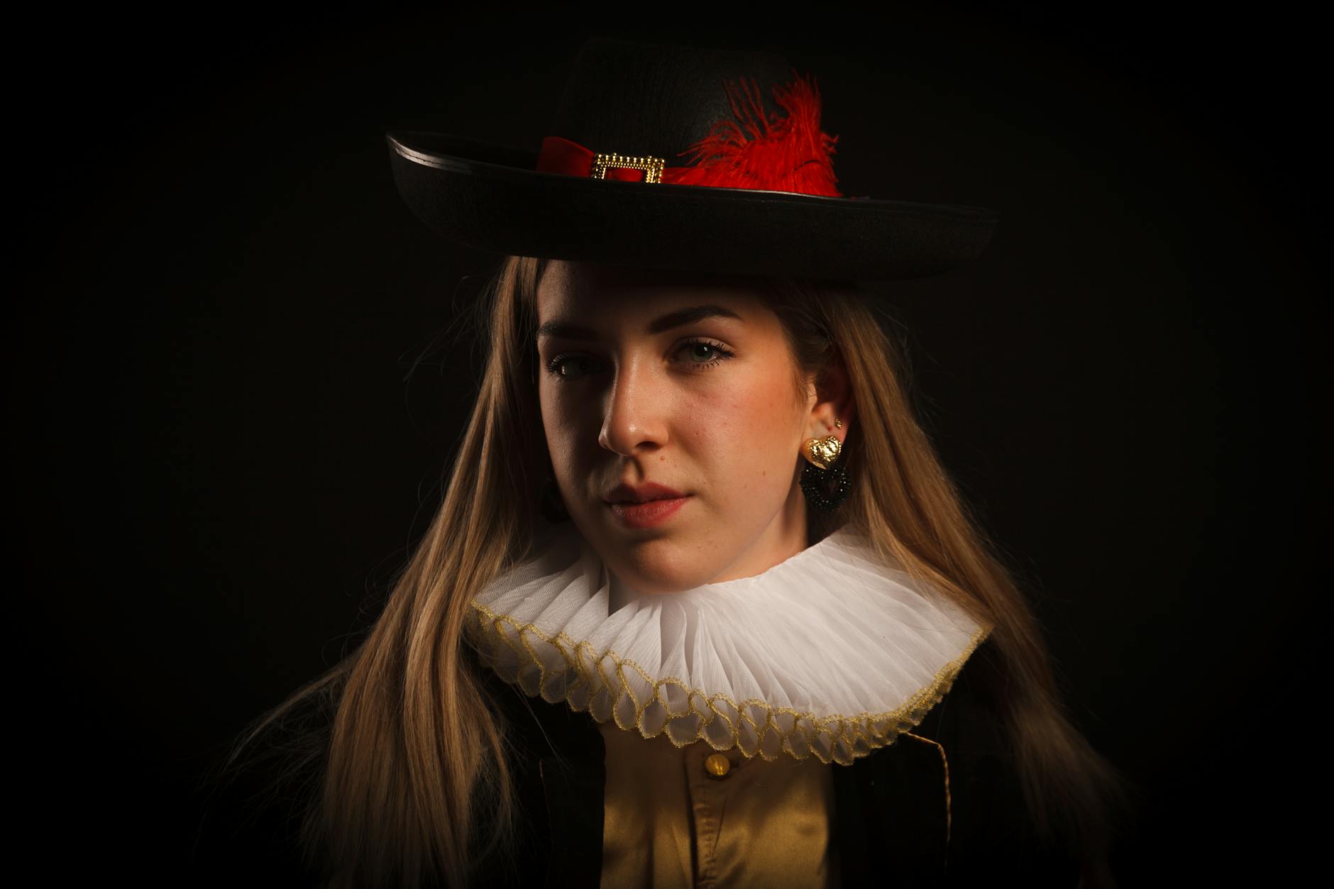 Model nie musi stać frontalnie do aparatu. W praktyce Rembrandt najlepiej działa przy lekkim skręcie głowy – zazwyczaj 20–45° od osi aparatu. Wtedy łatwiej o światło krótkie, które wyszczupla i naturalnie tworzy trójkąt na policzku po stronie cienia.